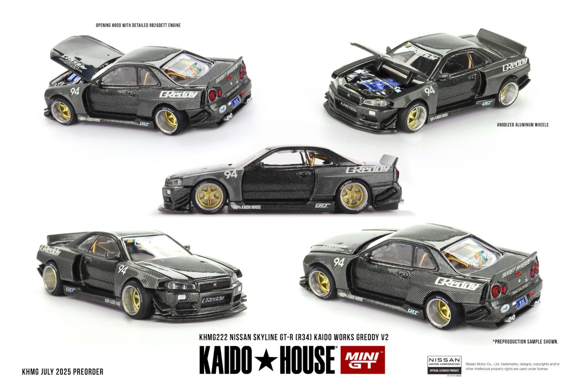Mini GT Nissan Skyline GT-R (R34) Kaido Works Greddy V2 1999 KHMG222 1:64