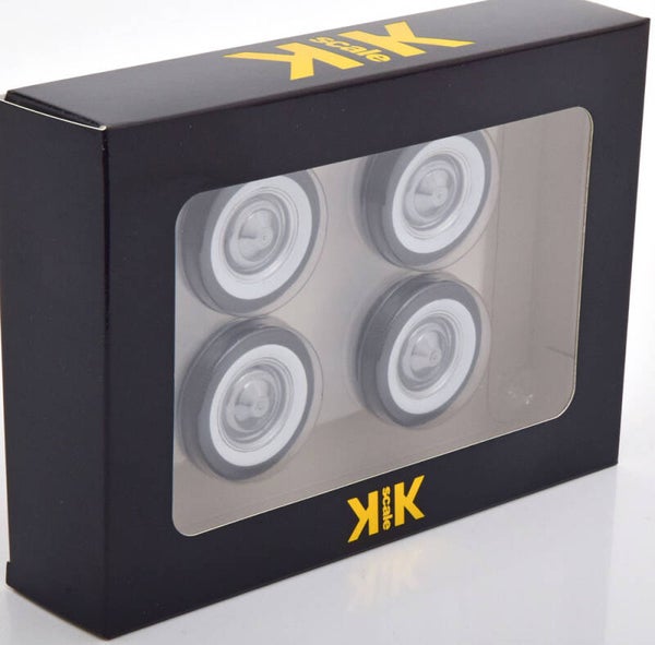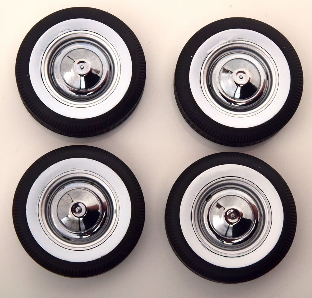Satz mit 4 Rädern für KK Scale Fiat 500 1:12, mit Chromradkappe und Weißwandreifen.